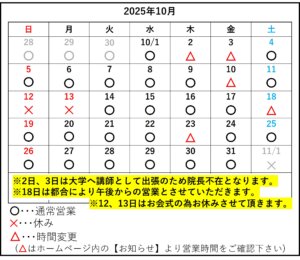 お電話でのお問い合わせは診療時間内のみとなっております。診療時間外は留守番電話になっておりますのでメッセージを残していただけますと、メッセージ確認後折り返しお電話いたします。